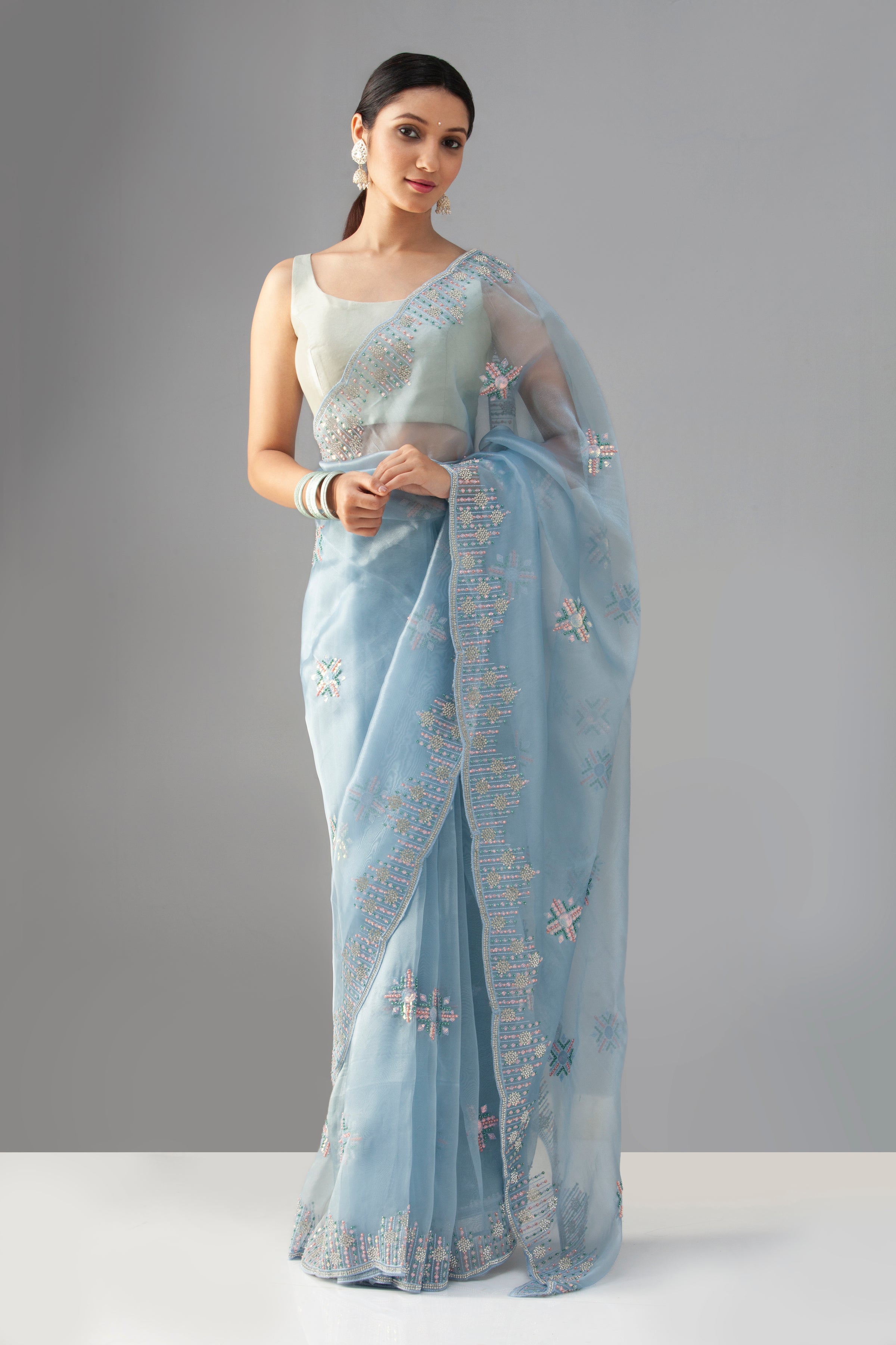 Saree fabric- Tissue Organza with hand work embellished with zircon stones and beads